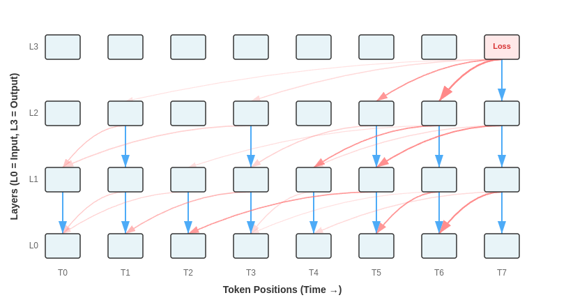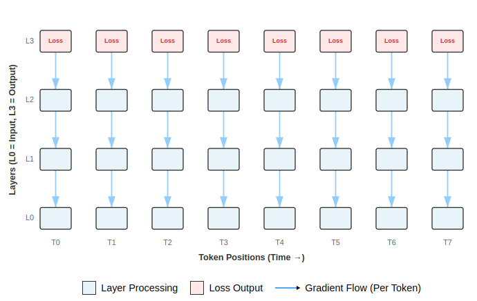 LLMs are hierarchical. Loss is projected backward through the parameters, such that every parameter that contributed to the output stands open to be modified. When you backpropagate through a transformer, the gradient from that final token prediction flows both down layers and backward through attention mechanisms to the computations performed on previous tokens. Attention creates a dense graph of connections: every token attends to many previous tokens, so gradients flow from each position back to everything it paid attention to, and potentially everything they pay attention to, and so on.